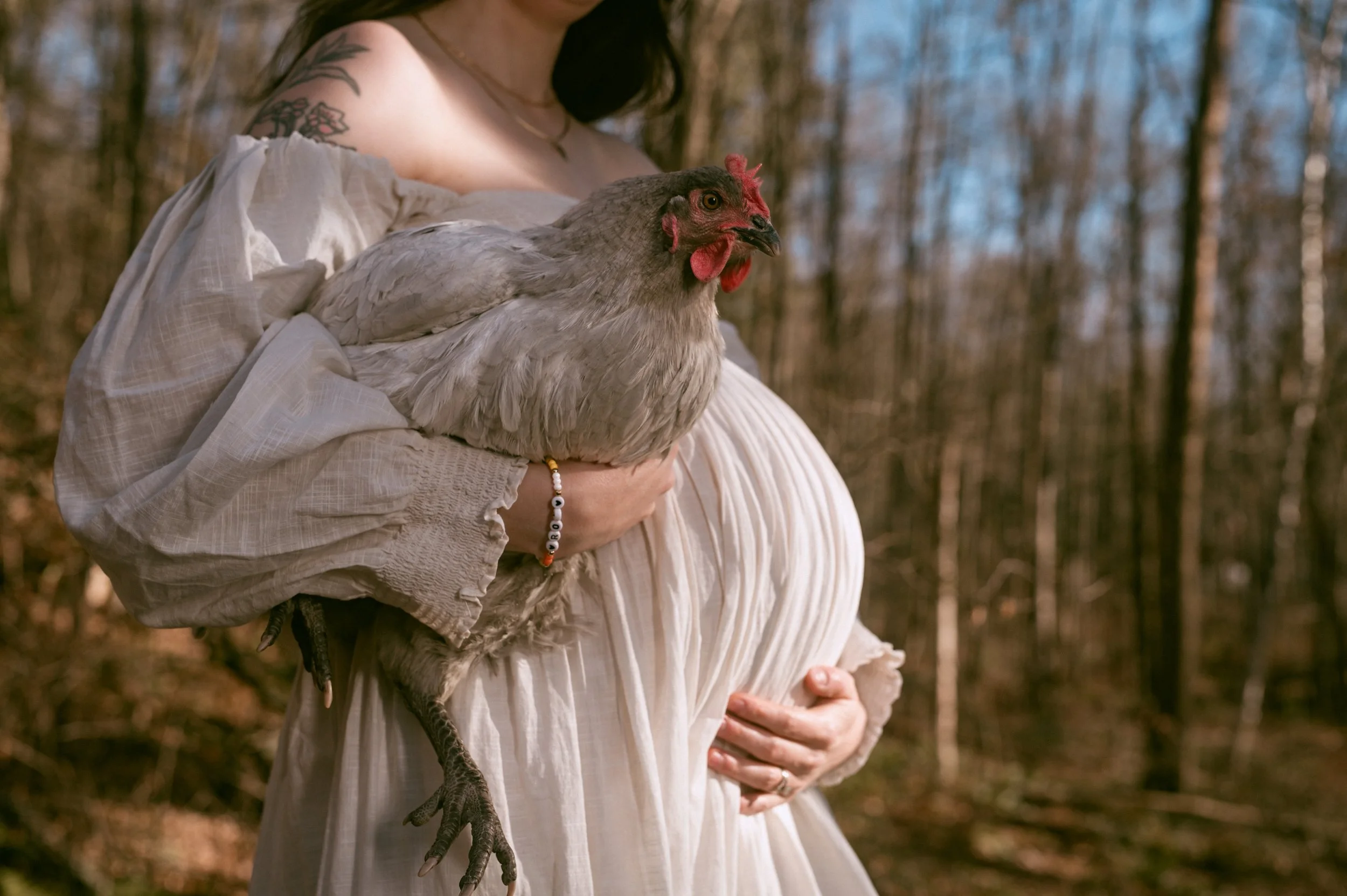 When Kelsey & Andrew asked where I’d drive to Great Barrington to capture a maternity session in their rural home with a dog and six chickens, I thought, is that even a question?? I love the mix of craggy, prehistoric weirdness and feathery grace you can see in a chicken; and a home with a chicken coup just feels so settled and self-sufficient. Loved mixing up some casual looks with a “woodland earth goddess” vibe and of course utilizing the autumn leaves.
